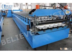 This wall panel forming machine is suitable for manufacturing colored steel wall panel. Its main components are decoiler, roll former, cutter, hydraulic pump station, product stable, and control cabinet, etc. The normal material thickness is roll coating with 0.3-0.8mm, and its forming width is equal to or less than 1250mm. The specific wall panel profile can be designed and made in line with customers' specific requirements.